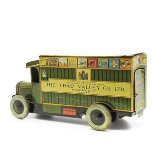 Chad Valley Co. Ltd. Spielzeug-Lieferwagen (Chad Valley), "The Chad Valley Co. Ltd. / Chad Valley Works. / Harborne. / Made in England."; an der Frontscheibe das Kennzeichen "CV10032"; am Kühlergrill der Schriftzug "Dennis", England, Harborne, ab 1952, Maße: 125 x 255 x 110 mm, guter Allgemeinzustand, Türbefestigungen ersetzt, Schlüssel fehlt