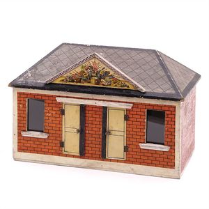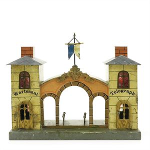 Märklin, Gebr. und Cie. Bahnhof zum Beleuchten, ungemarkt, Deutschland, Göppingen, um 1905, Maße: 225 x 270 x 125 mm, ordentlicher Allgemeinzustand, erhebliche Gebrauchs- und Altersspuren, Tonnengewölbe und Dächer farblich restauriert, 1 Türknauf fehlt, Flagge ergänzt
