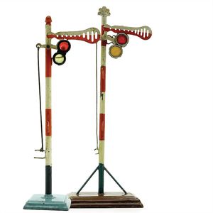 Märklin, Gebr. und Cie. 2 Teile Hauptsignal, gemarkt "Germany" Deutschland, Göppingen, um 1920, Maße: 205 x 70 x 45 mm, Allgemeinzustand, ohne Lampe, Hauptsignal, ungemarkt, Deutschland, Göppingen, um 1910 , Maße: 260 x 100 x 60 mm, guter Allgemeinzustand, Gebrauchsspuren Deckscheiben mit kl. Fehlstellen, Halterungen für den Draht verbogen