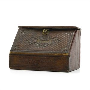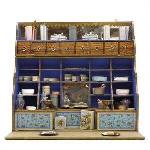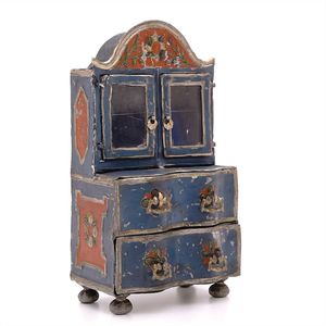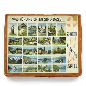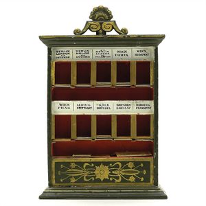 Märklin, Gebr. und Cie. Fahrkartenschrank, ungemarkt; 15 Fahrkarten mit den frühen Firmensignet, 9 mit dem späten (ab 1930), 6 auf der Rückseite mit Werbung "Spielwaren / Franz Carl Weber / Zürich / 62 mittlere Bahnhofstrasse 62", Deutschland, Göppingen, 1904 – 1914, Maße: 195 x 128 x 74 mm, sehr guter Allgemeinzustand
