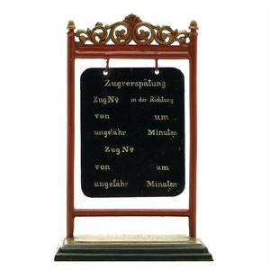 Märklin, Gebr. und Cie. Verspätungsanzeige, ungemarkt, Deutschland, Göppingen, 1900 – 1911, Maße: 185 x 115 x 63 mm, guter Allgemeinzustand, altersbedingte Krakeleebildung, 1 Aufhänghaken gelöst