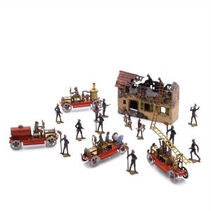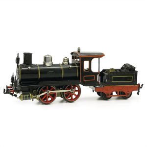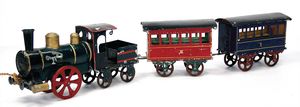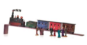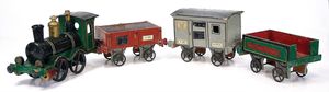 Märklin, Gebr. und Cie. 4 Teile Eisenbahn, Marke an beiden Seiten des Kessels die Initialen "G.M. & Cie", Deutschland, Göppingen, ab 1892, Maße: 150 x 850 x 85 mm, guter Allgemeinzustand, Gebrauchs- und Altersspuren, Figuren und Schnur ergänzt