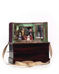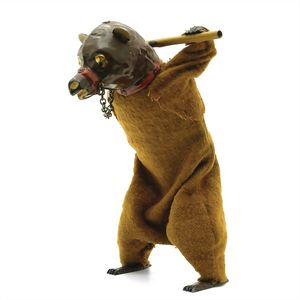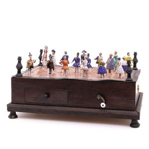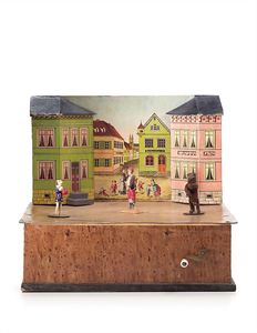 Zinner & Söhne, Gottlieb Klingkästchen (Dorfplatz mit Bärentanz), ungemarkt, Deutschland, Schalkau, um 1880, Maße: 180 x 205 x 220 mm, guter Allgemeinzustand, roter Ball des Hundes nicht original, Bär wohl original mit Stab; funktionstüchtig