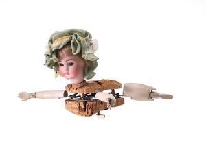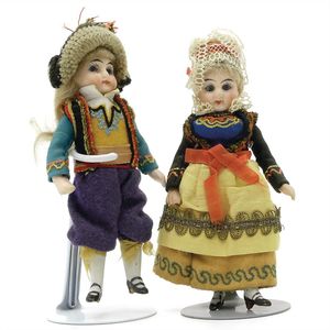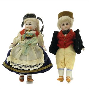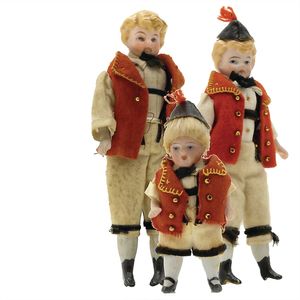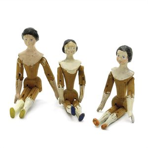 Gliederpuppen (Holz), ungemarkt, Deutschland, Thüringen, um 1880, Maße: 125 mm, guter Allgemeinzustand, 1 Puppe mit Spalt im Rücken,1 Puppe mit falsch eingesetztem linken Arm und losem linken Bein, 2 Puppen mit Retuschen im Kopfbereich
