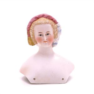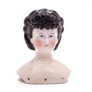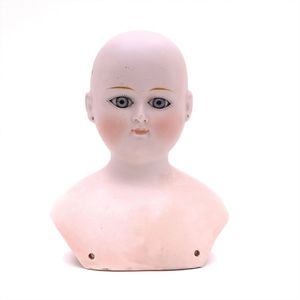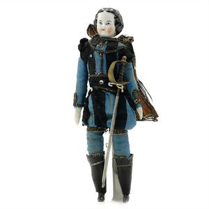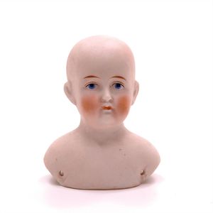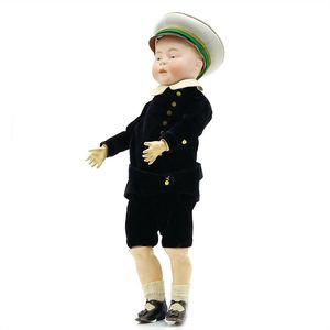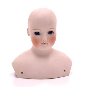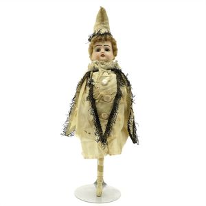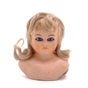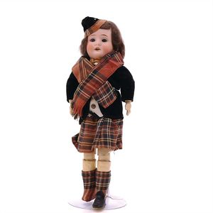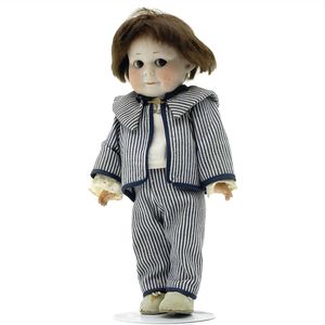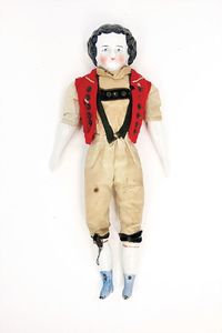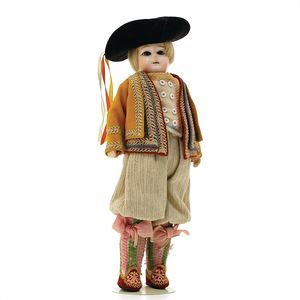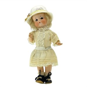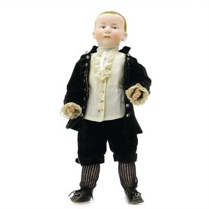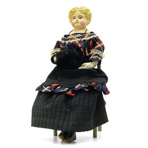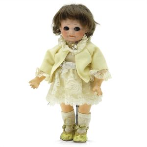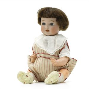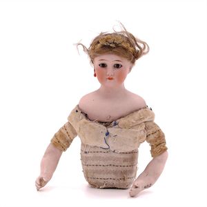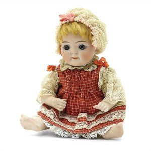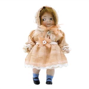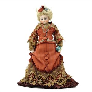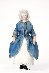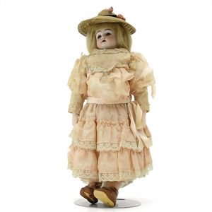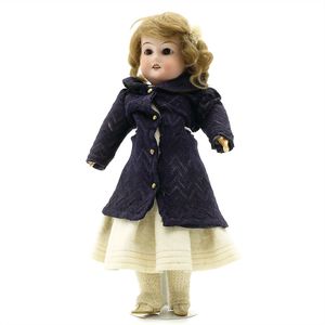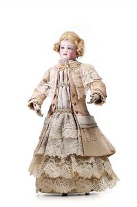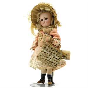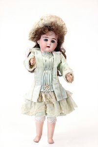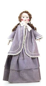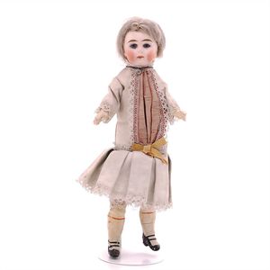 Dressel, Cuno & Otto Mädchenpuppe, Halsmarke "C., Made in Germany", Deutschland, Sonneberg, 1890 – 1895, Maße: 345 mm, Biskuitporzellan (Brustkopf und Unterarme), guter Allgemeinzustand, Zähne fehlen; Perücke ergänzt; Kleidung teilweise später, Seidenkleid stellenweise zerschlissen, beim rechten Schuh fehlt die Karton-Sohle