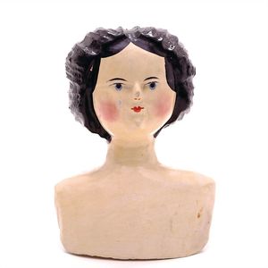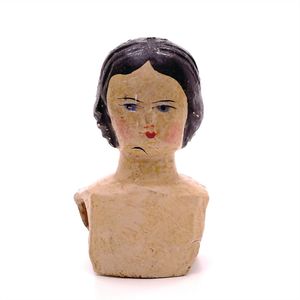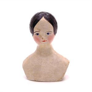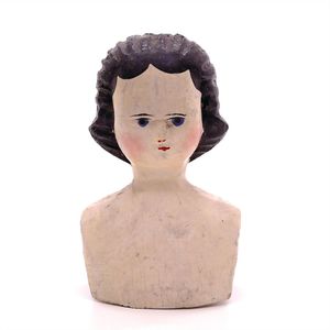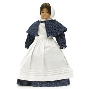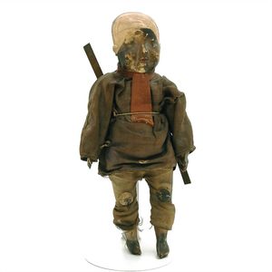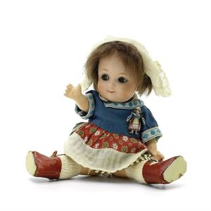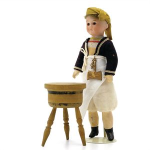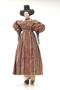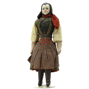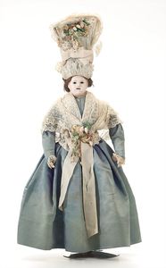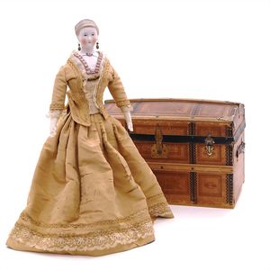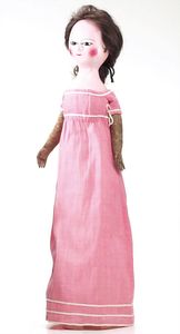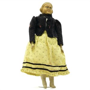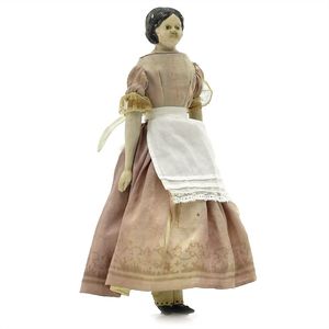 Queen Anne Holzpuppe, ungemarkt, England, 1780 – 1790, Maße: 380 mm, guter Allgemeinzustand, Rissbildung im Bereich der linken Wange, Perücke und Kleidung ersetzt, originales Kleid im Rahmen, dieses mit einzelnen Stopfstellen (vor allem Streifen an der linken Seite), Sohle beim linken Fuß fehlt, am Hinterkopf und an den Schläfen Spuren der früheren Perücke, (aus der Sammlung Marianne Bodner, Zürich)