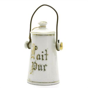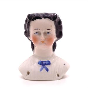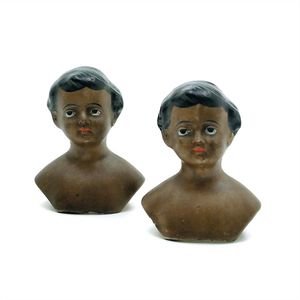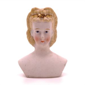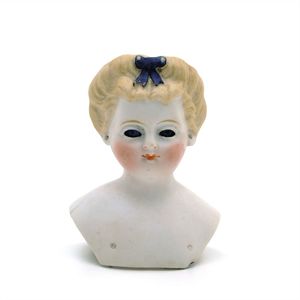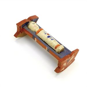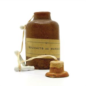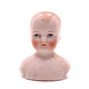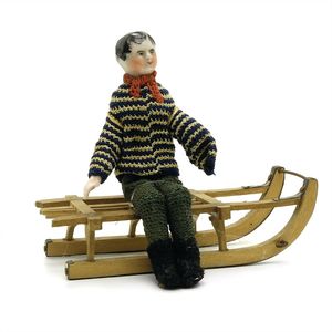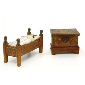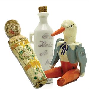 Konv. 3 Teile, 1 Fatschenkind, ungemarkt, Deutschland, Oberammergau, 1820 – 1840, 5 cm, berieben, 1 Scherzflasche, ungemarkt, Deutschland, Thüringen, um 1920, 7,5 cm, glasiertes Porzellan, Schriftzug stellenweise abgerieben, 1 Storchenfigur, ungemarkt, Erzgebirge, um 1930, 5 cm, sehr guter Allgemeinzustand