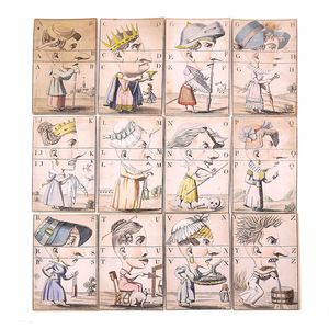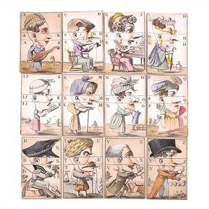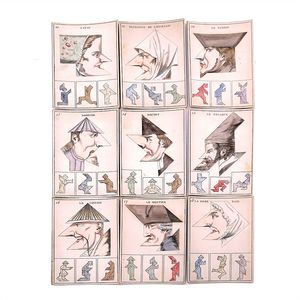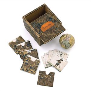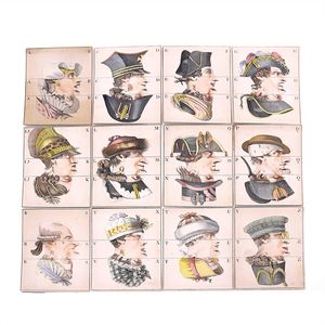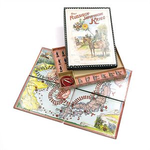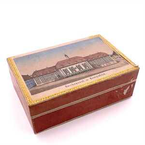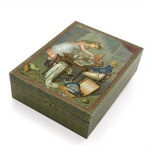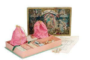 Klassen-Lotterie - Lotterie de Classes - The lottery in classes, Deckelillustration mit verschlungenem Markenzeichen in Form eines großen "A", Druckwalze als Unterstrich, in der Initiale ein weiteres A sowie die Buchstaben D und C (?) = bekanntes Signet für hochwertige Papierspiele, bisher jedoch nicht entschlüsselt; auf der Unterseite des Bodens die Angabe "Nii Ing" in Tinte, Deutschland, Nürnberg, um 1850, Maße: 47 x 312 x 212 mm, guter Alllgemeinzustand