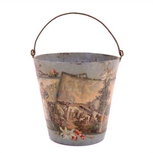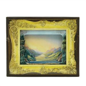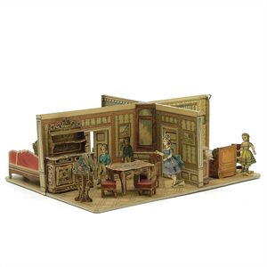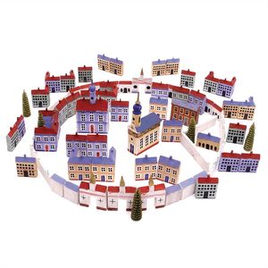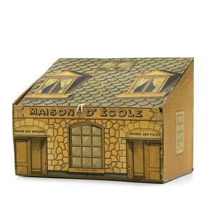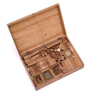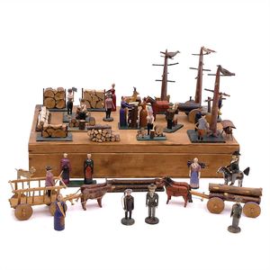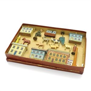 Zeumer, Richard Seyffert, Oskar, Beteiligung Das erzgebirgische Dörfchen, Marke am Boden der meisten Gebäude Nummerierungen und Stempel vom "Spielwarenhaus / Richard Zeumer / Dresden, Schlossstr. 34", außerdem Werbestempel für "Neu Geländetafeln / Mappe mit 6 St 50 Pf"; 2 Gebäude am Boden mit Klebeetikett - u.a. Werbung für "Pläne zum Aufstellen, / unendlich zusammenstellbar, als: Fluss, Bach, / Strasse, Pfad, Verbindungsstücke, à Serie 40 Pf."; unter den Beeten der Stempel "Natura / No. / Preis", dazugestempelt die Nummern 76 und 78; unter der Kirche Klebeetikett mit der alten Inventarnummer "191.", Deutschland, Erzgebirge / Dresden, um 1913, Maße: 120 x 102 x 43 mm, Maße: 57 x 112 x 47 mm, guter Allgemeinzustand, Gebrauchsspuren
