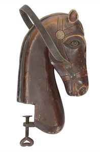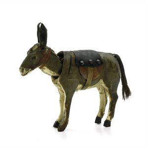 Esel mit Wackelkopf, ungemarkt, Deutschland, Thüringen, um 1910, Maße: 85 x 95 x 25 mm, guter, funktionstüchtiger Allgemeinzustand, Sattel und Schweif ersetzt, Glasaugen fehlen, Mähne nur noch in Fragmenten vorhanden, Zaumzeug im Maulbereich inkomplett