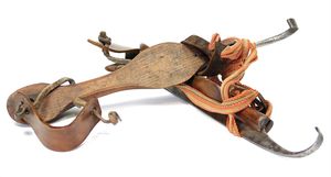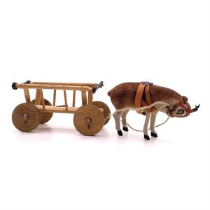 Erzgebirge Ziegengespann (Leiterwagen), ungemarkt, Deutschland, Erzgebirge, um 1910, Maße: 53 x 180 x 57 mm, guter Allgemeinzustand, Hörner verformt, Zaumzeug geklebt und mit Ergänzungen, Zugschnüre ersetzt und mit Siegellack fixiert, Leiterwagen ohne Deichsel