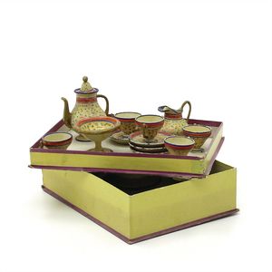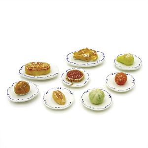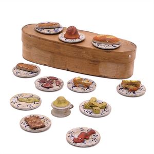Schaugerichte, ungemarkt, Deutschland, Thüringen, 1890 – 1900, Maße: 25 x 60 x 40 mm, Biskuitporzellan, guter Allgemeinzustand, Bemalungen zum Teil stark berieben, 1 Platte und 1 Teller mit Randabbrüchen (Teller geklebt)