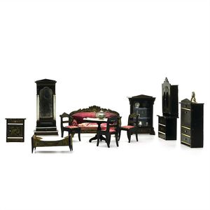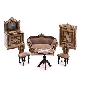 Ameublement, Mobiliar, Sitzgruppe, Sofa, Salon, Wohnzimmer, Spiegelkommode, Kleiderschrank, Schlafzimmer, ungemarkt, Deutschland, Thüringen, um 1870, Maße: 110 x 72 x 45 mm, Maße: 75 x 122 x 47 mm, guter Allgemeinzustand