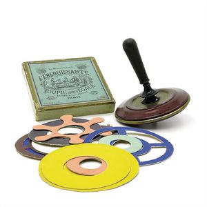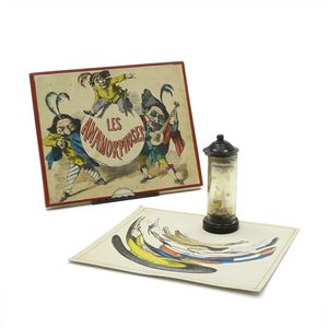 E Davidstern L'éblouissante Toupie sans Egale (optischer Kreisel), diverse Aufschriften, u.a. Boîte No.1 Ordre; mit Inschrift Science Plaisir, 2 Silbermedaillen (Paris 1872 und 1878); auf Kreiseloberfläche Prägung "BREV. S.G.D.G. - DEP - E*C", Frankreich, Paris, um 1880, Maße: 21 x 130 x 130 mm, Durchmesser: 120 mm, guter Allgemeinzustand, Gebrauchsspuren, unvollständig, Spielanleitung mit Einrissen