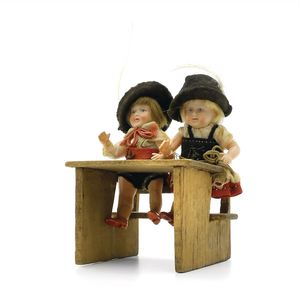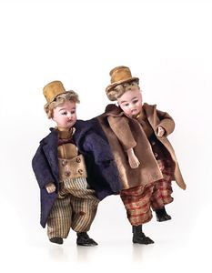 Tippelbrüder (Betrunkene), Halsmarke 7013 (?), wohl Frankreich, um 1890, Maße: 180 x 160 x 80 mm, Biskuitporzellan (Köpfe), guter, funktionstüchtiger Allgemeinzustand, 1 Fuß mit Abplatzer, 1 Unterarm ersetzt, Kartonschichten der Zylinder lösen sich