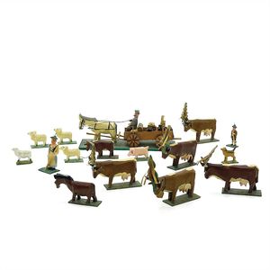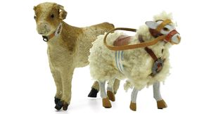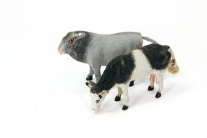 Bauernhoftiere, Kalb, ungemarkt, Deutschland, Thüringen, um 1910, Maße: 62 x 77 x 23 mm, guter Allgemeinzustand, linker Vorderhuf geklebt, Glocke fehlt, Schaf, ungemarkt, um 1920, Maße: 44 x 58 x 19 mm, guter Allgemeinzustand
