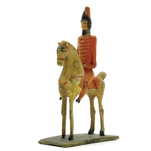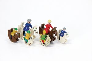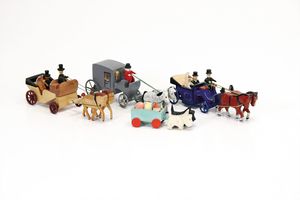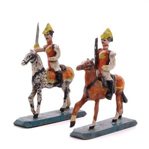 Erzgebirge Miniatur Fahrzeuge, 1x Hundefuhrwerk mit Spielzeug, Deutschland, Erzgebirge, 1950 – 1960, guter Allgemeinzustand, leichte Gebrauchs- und Klebespuren, 1x Schaukelreiter, ungemarkt, Deutschland, Erzgebirge, um 1940, guter bis sehr guter Allgemeinzustand, die 4 größeren Reiter nahezu ladenneu, die 2 kleineren mit leichten Alters- und Gebrauchsspuren wie Abrieb, bei 1 Reiter womöglich Rückenstütze ersetzt