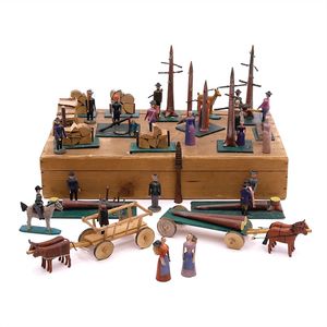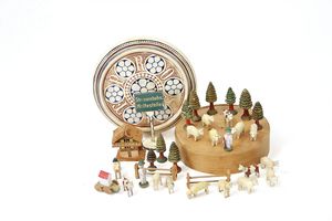 Erzgebirge Holzschlag, Deutschland, Erzgebirge, um 1880, Maße: 75 x 395 x 425 mm, guter Allgemeinzustand, wenige Teile wie der Spanbaum (ohne Standfuß) und kleine Frauenfigur nicht original zugehörig