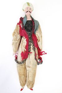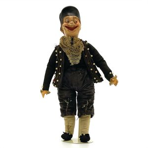 Queen Anne Holzpuppe, ungemarkt, England, 1780 – 1790, Maße: 370 mm, guter Allgemeinzustand, Nase und Wange ausgebessert, Beine, Perücke und Kleidung ersetzt, am Hinterkopf Spuren der früheren Perücke, (aus der Sammlung Marianne Bodner, Zürich)