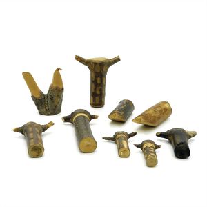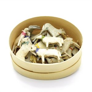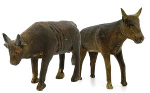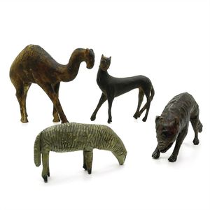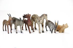 Konv. Tiere, 1 Apfelschimmel, 105 x 135 x 38 mm, starke Gebrauchsspuren, 1 Esel geschnitzt,: 82 x 115 x 40 mm, guter Allgemeinzustand, 1 Steinbock, ungemarkt, Maße: 75 x 92 x 28 mm, ordentlicher Allgemeinzustand, Farbverluste, 1 Rehbock, 98 x 97 x 25 mm, , Farbverluste, 1 Hirsch, 100 x 83 x 25 mm, mäßiger Allgemeinzustand, , alles ungemarkt, wohl Alpenländisch, um 1880