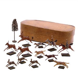 Erzgebirge Konvolut Treibjagd, ungemarkt; Schachteldeckel Datierung 1885, Deutschland, Erzgebirge, 1870 – 1880, Holz, Brotteig, Draht, Luffa, Orig.-Zustand mit Beschädigungen und FehlstellenLuffabaum später hinzugefügt