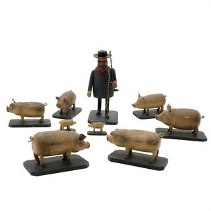 Schweinehirt mit Herde, gestempelt: Elefant von vorne mit Inschrift "EINGETRAGENE SCHUTZMARKE", Deutschland, wohl Berchtesgaden, um 1905, guter Allgemeinzustand