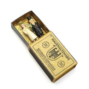 Erzgebirge Zündholzschachtel mit Hochzeitspaar, ungemarkt; auf der Rückseite der Schachtel in Tinte "Zum Namenstag 1931"; innen am Sockel "z. Namensfest", Deutschland, Erzgebirge, 1931, Maße: 16 x 57 x 37 mm, guter Allgemeinzustand, Schachtel mit Verschmutzungen