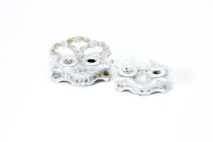 2x Schreibutensilien, ungemarkt, Deutschland, Thüringen, um 1890, Maße: 27 x 58 x 55 mm, glasiertes Porzellan, guter Allgemeinzustand, kleine Reparaturen an den Zierbögen und Kanten, stellenweise Farbverluste
