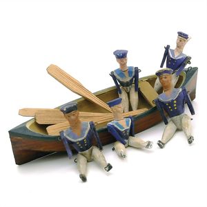 Erzgebirge Ruderboot mit 7 Matrosen, ungemarkt, Deutschland, Erzgebirge, um 1910, Maße: 38 x 163 x 42 mm, guter Allgemeinzustand, Gebrauchsspuren, Bemalung berieben, einige Farbabplatzer