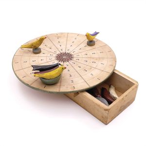 Erzgebirge Vogelspiel, ungemarkt, Deutschland, Erzgebirge, 1860 – 1870, guter Allgemeinzustand, Gebrauchsspuren 2 Vögel fehlen, 8 Vögel ohne Standfüße, 1 weiß-brauner Vogel mit defektem Schwanzgefieder