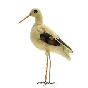 Storch mit Baby im Bauch, Hochzeitsgabe, ungemarkt, Deutschland, Thüringen, um 1910, Maße: 158 x 65 x 110 mm, guter Allgemeinzustand, Puppe sehr gut erhalten