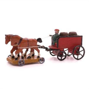 Flath, Arthur, Seiffen Pferdefuhrwerk mit Fässern (Miniatur), Händlerstempel "Stark / Wilmersdorf", Deutschland, Seiffen (Erzgebirge), 1930, Maße: 36 x 95 x 28 mm, guter Allgemeinzustand, Schnüre und 1 Rad ersetzt, 1 kleines Rad (bei den Pferden) mit fehlender Speiche, Fässer möglicherweise ergänzt