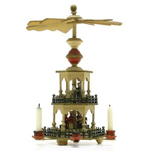 Erzgebirge Weihnachtspyramide, ungemarkt, Deutschland, Erzgebirge, um 1920, Durchmesser: 150 mm, Maße: 220 mm, ordentlicher, funktionstüchtiger Allgemeinzustand, oberes Geländer fehlt