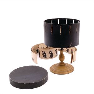 Lebensrad (Zootrop), ungemarkt, Frankreich, 1890 – 1900, Durchmesser: 172 mm, Maße: 250 mm, Gebrauchsspuren