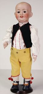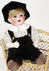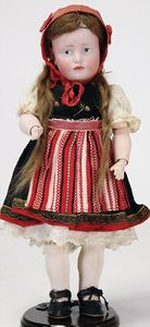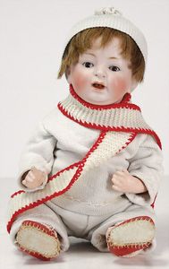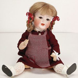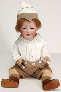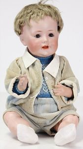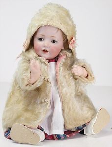 GOEBEL Biskuitporzellan-Charakterpuppe, 46 cm, braune Schlafaugen, Augenmechanismus neuer, off. Mund, Zähne u. Zunge, Sitzbabykörper überstrichen