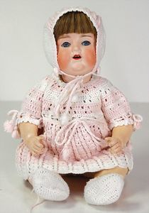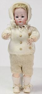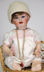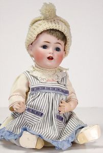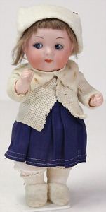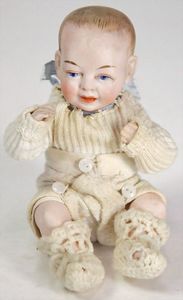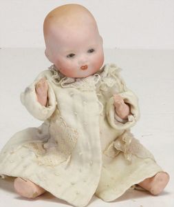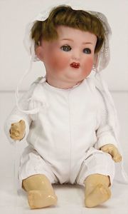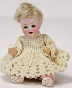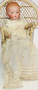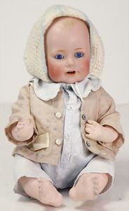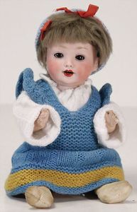 ARMAND MARSEILLE 351, Dreambaby, 19 cm, Biskuit-Kurbelkopf, blaue fest eingesetzte Glasaugen, off. Mund, oben Zähne, Sitzbabykörper, alte Kleidung