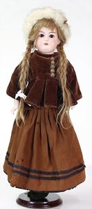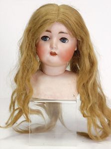 HEUBACH 342, Biskuitporzellankopf-Puppe, 38 cm, braune Schlafaugen, off. Mund, Zähne u. Zunge, Kinngrübchen, Masse-Stehkörper, Perücke wurde nicht entfernt, von außen keine Risse erkennbar, Transportrisiko für Augenmechanismus beachten