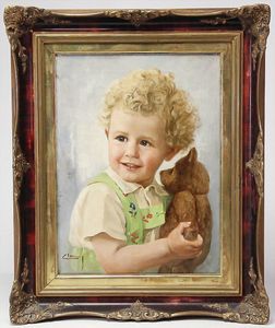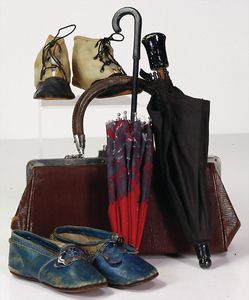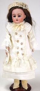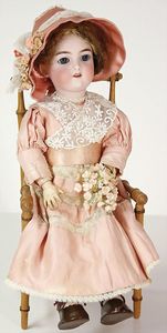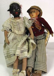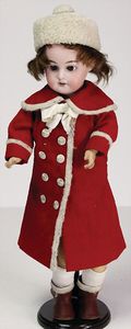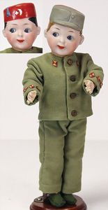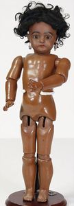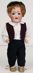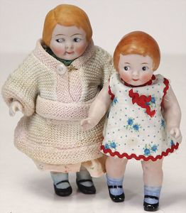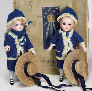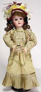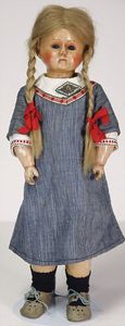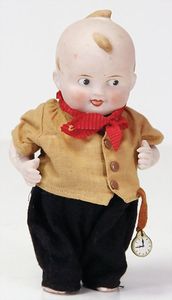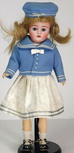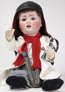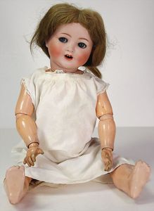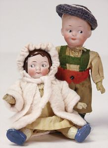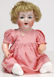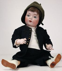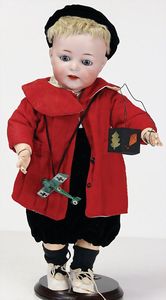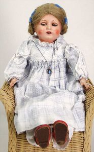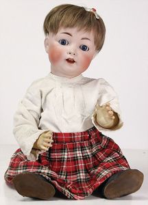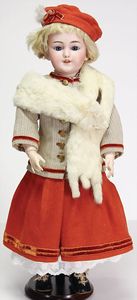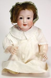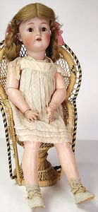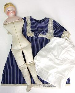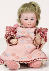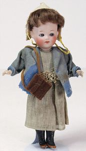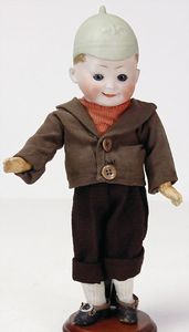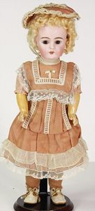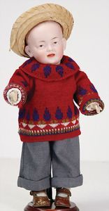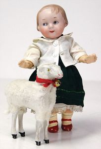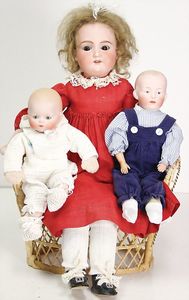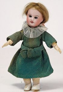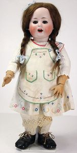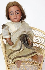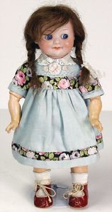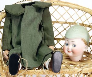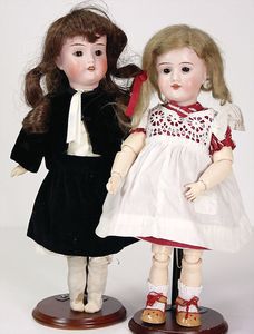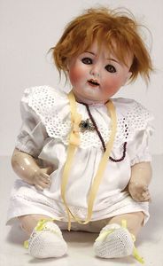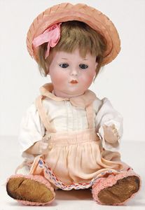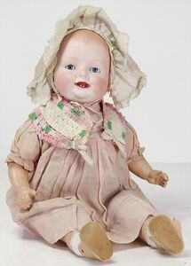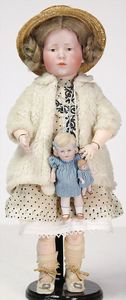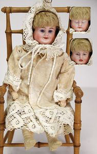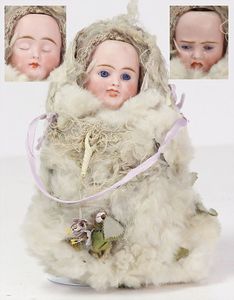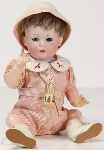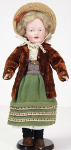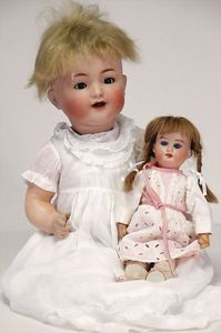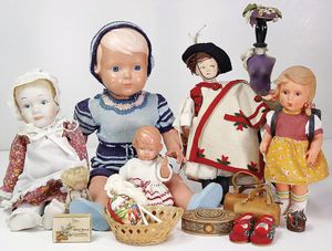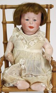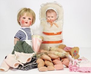 2 Teile, Biskuit-Brustblattkopf, Flora Dora, braune Schlafaugen, ,off. Mund, Zähne u. Zunge, Perücke neuer, Lederkörper, Biskuit-Unterarme, dazu 1 Heubach Sonne, Brustblattkopf, Junge, Intaglioaugen, geschl. Mund, Lederkörper, Celluloid-Unterarme, 1 Biskuitpuppe, Einbindekopf, neuer