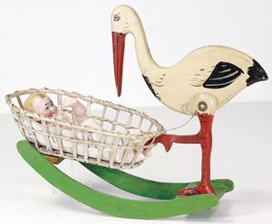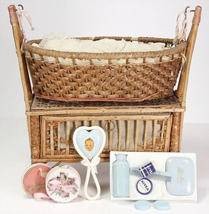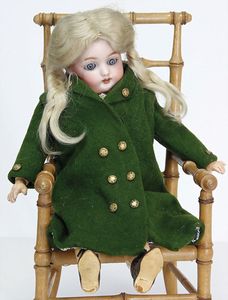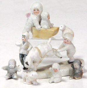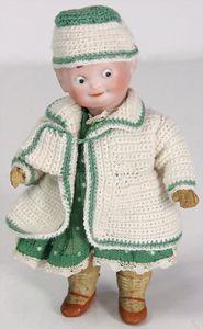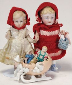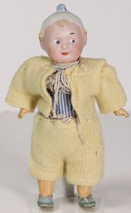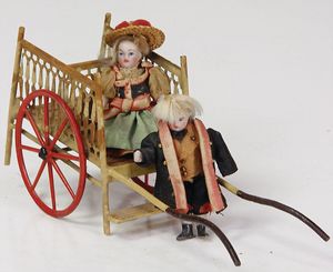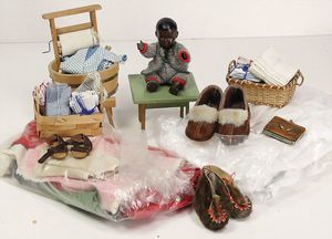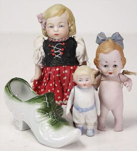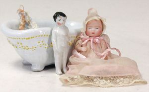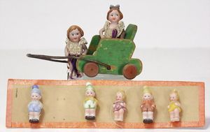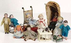 Konv. 10 Puppenstubenpuppen, meist Porzellan, mit anmodellierten Schuhen u. Strümpfen, dazu 2 Schaukelstühle, Blech, 1 Strandkorb, kl. Blech-Puppenwagen, mit Porzellan-Baby, 1 kl. Blech-Puppenbett, mit 2 kl. Püppchen, 4 cm