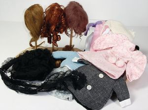 Fundkiste, Perücken, Kleidung, Ersatzteile, jünger u. älter, 1 Papiermaché-Kopf, im Steckkissen, 1 Masse-Puppen, Schönau & Hoffmeister 170