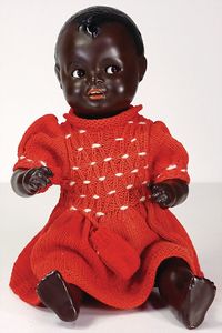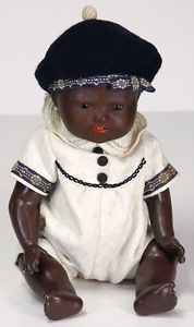 Konv. Celluloid, Minerva, Charakter-Junge, 28 cm, fester Kopf, gemalte Augen, bewegl. Arme u. Beine, Hinterkopf ausgebessert, Schildkröt Hans, Celluloid, 25,5 cm, helle modellierte Haare, 1 farbiges Cellba Baby, 30 cm, neuer