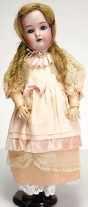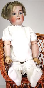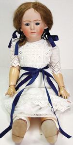 HEUBACH 342, Biskuitporzellankopf-Puppe, 58 cm, blaue Schlafaugen, off. Mund, Zähne u. Zunge, Kinngrübchen, Masse-Stehkörper, Perücke zu klein
