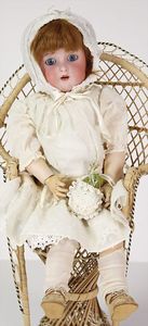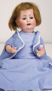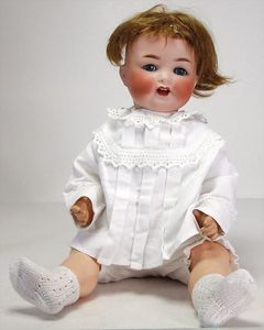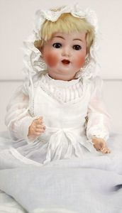 KÄMMER & REINHARDT 126 45 cm, blaue Schelmenaugen, off. Mund, Zähne u. Zunge, Sitzbabykörper, alte Mohairperücke, minim. Chip am Augenlid oben, kaum sichtbar