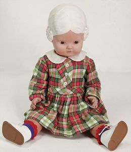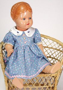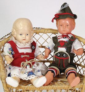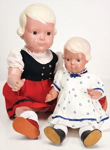 2 Teile Celluloid, Inge, 41 cm, Kurbelkopf, blaue fest eingesetzte Glasaugen, helle modellierte Haare, sonnenbraun, bespielt, gut, Inge, 56 cm, braune fest eingesetzte Glasaugen, helle modellierte Haare, guter Zust., alte Kleidung u. Schuhe