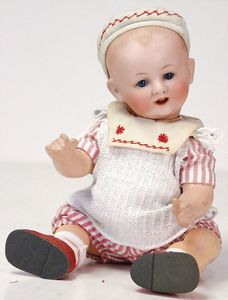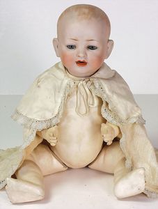 Biskuitporzellan-Charakterbaby, gemarkt HW 38W, 40 cm, Kurbelkopf, nachtr. blaue fest eingesetzte Glasaugen, off. Mund, Zähne u. Zunge, bespielter Sitzbabykörper, alte Echthaarperücke