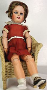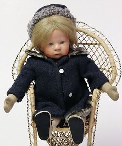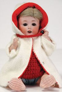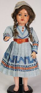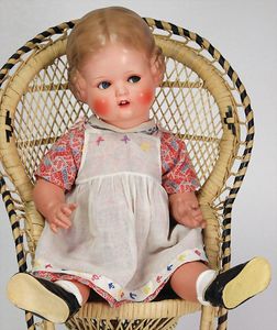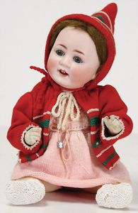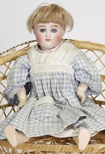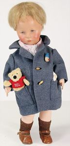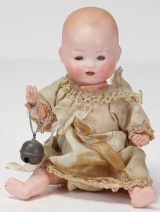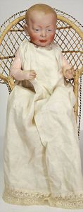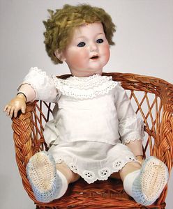 KÖNIG & WERNICKE 688/33, Kurbelkopf, blaue Schelmenaugen (hängen fest), ausmodellierte Haare, Masse-Stehkörper, Transportrisiko für Augenmechanismus beachten, 1 Masse-Puppe, 27 cm, kl. Korb mit Bär u. Puppe