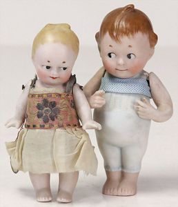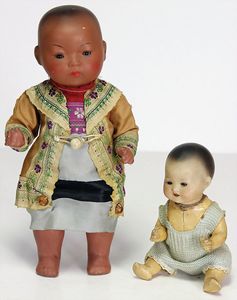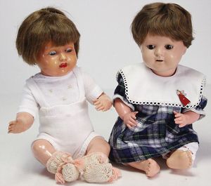 2 Teile Celluloid, König & Wernicke 298/5, Miblu, Kurbelkopf, blaue Schlafaugen,, off./geschl. Mund, Sitzbabykörper von Schildkröt, Perücke wurde nicht entfernt, Transportrisiko für Augenmechanismus beachten, Bruno Schmidt, Kurbelkopf, braune Schlafaugen, off. Mund, oben Zähne, Sitzbabykörper, Arme Schildkröt, Perücke fest aufgeklebt, Transportrisiko für Augenmechanismus beachten