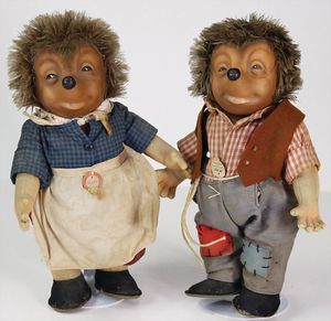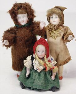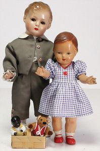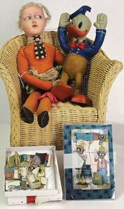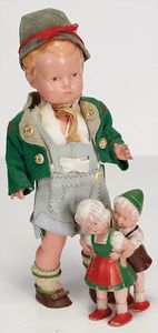 Konv., Schildkröt Inge, Celluloid-Kurbelkopf, auf Masse-Körper, Gr. 45, 1 Kopf Hans, Celluloid, sonnenbraun, Gr. 45, helle modellierte Haare, 1 x Erika, Tortulon, 29 cm, fester Kopf, blaue fest eingesetzte Glasaugen, bespielt