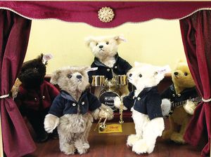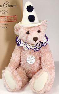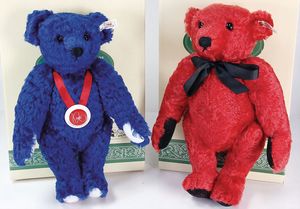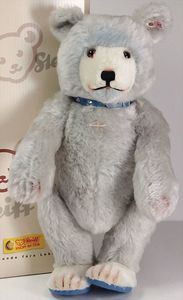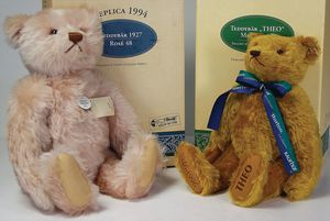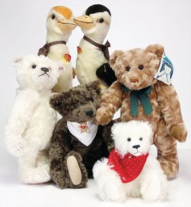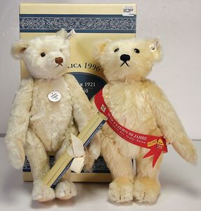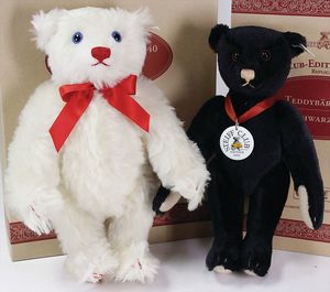 Konv. Steiff, neuere Produktion, Klassik Teddy, 1920, 38 cm, weißer Bär, Leopold, limited edition, Ente Huschel, 2 versch. Farben, dazu 2 Künstlerbären, untersch. Hersteller, mit Knopf, Fahne u. Schild, ohne Kart. u. Zertifikat, sehr guter Zust.