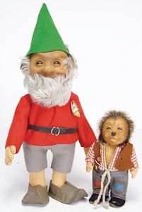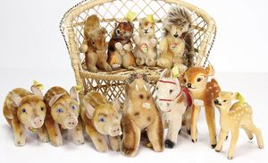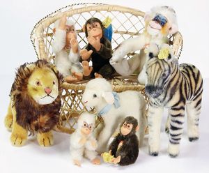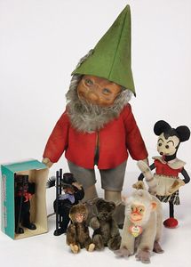 Konv. Plüschtiere, darunter Steiff Zwerg, 30 cm, Vinyl Kopf mit Krakeleebildung, kl. Coco, 2x Macki Schornsteinfeger, 8 cm, kl. Bär, 8 cm, kl. Schuco Affe mit Blechgesicht, 1 Arm fehlt, 1 Karikatur-Mickey Mouse Filz, Drahtbeine- u. Arme, 16 cm